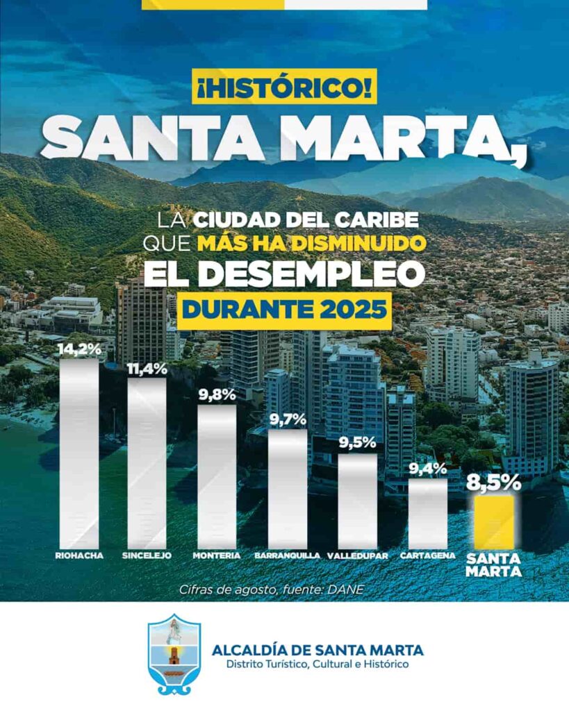 Este logro ubica a Santa Marta como la octava ciudad con menor desempleo entre las 23 capitales del país, y la primera en la región Caribe, superando a ciudades como Cartagena, Barranquilla, Montería y Riohacha.