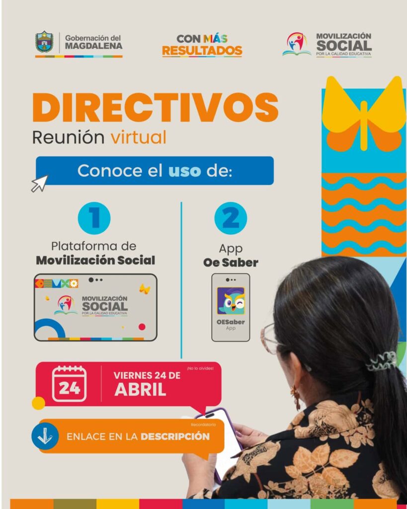 La Gobernación del Magdalena, a través de la estrategia de Movilización Social por la Calidad Educativa, invitó hoy viernes 24 de abril, a todos los directivos docentes de las 153 Instituciones Educativas Departamentales a participar en la reunión virtual a partir de las 3:00 p. m., con el fin de socializar dos herramientas digitales clave que acompañarán el desarrollo del proyecto durante la vigencia 2026, orientadas al fortalecimiento de los procesos académicos de los estudiantes y al acompañamiento pedagógico de las instituciones.