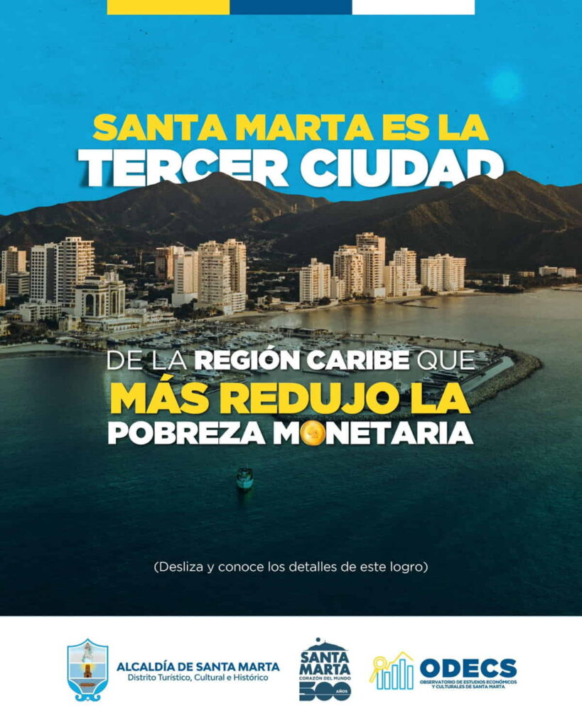 «Santa Marta hoy tiene resultados que marcan la diferencia en la vida de su gente. Según el más reciente informe del DANE, la ciudad redujo su índice de pobreza monetaria del 41,5 % en 2023 al 37,9 % en 2024, una disminución de 3,6 puntos porcentuales que la posiciona como la tercera ciudad capital de la región Caribe con mayor reducción en este indicador. Este logro significa que alrededor de 17 mil samarios dejaron atrás la pobreza monetaria en solo un año, ampliando sus posibilidades de acceder a bienes y servicios esenciales». contó el secretario de Desarrollo Económico y Competitividad Carlos Jaramillo Ríos.